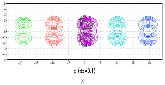 The KdV equation was derived based on asymptotic expansion of small perturbation i.e., . According to (16) with B = 0.6, we obtain , which is consistent with the perturbation of water height shown in Figure 5a,b, but does not satisfy . Hence, it needs higher-order terms to represent the KdV solution, as discussed in [29,35,36,37] and in shallow water modeling [32].