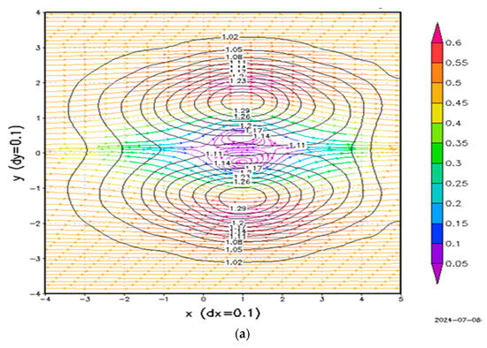 Using forward integration at t = 120 (purple in Figure 1a or black in Figure 1b) as the initial condition, the Rossby wave moves eastward as time decreases, initially at t = 120 (black), t = 90 (red), t = 60 (green), t = 30 (blue), and t = 0 (purple), as shown in Figure 1b, from backward integration. The heights and circulations after 120 time units from backward integration at t = 0 (Figure 2b) are quite comparable to its initial conditions at t = 120 in forward integration (Figure 2a). The soliton does return to its original position, but the velocity does not follow u(−t) = −u(t) as suggested by Eckhardt and Hascoët [9] or Fang et al. [10]. We conclude that the system is reversable if the change in velocity and height satisfies d ξ(−t) = −d ξ(t), which is consistent with Equations (7)–(11). The results also prove that the model without modification can be applied to both forward and backward integrations.