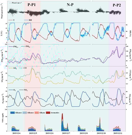The time series of meteorological parameters (wind direction, wind speed, temperature, and relative humidity) and air pollutants (PM2.5, PM10, SO2, CO, O3, and NO2) during the observation period are presented in Figure 2. Throughout the observation period, average temperature and relative humidity were 8.0 ± 4.9 °C and 67.9 ± 27.3%, respectively, but wind speed varied significantly (0–4.1 m/s). For the air pollutants, the diurnal variations of O3 and NO2 concentrations exhibited a negative correlation, with relatively stable daily averages ranging from 31.1 to 42.0 µg m−3 and 30.8 to 62.1 µg m−3, respectively. Concentrations of PM2.5, PM10, CO, and SO2 showed considerable variations during the observation period. Notably, the daily average concentrations of these four pollutants were higher on December 5 and December 11 than those on the other observation days. The daily average PM2.5 concentrations on December 5 and December 11 were 61.6 ± 17.0 µg m−3 and 89.8 ± 25.0 µg m−3, respectively, with the latter exceeding the national secondary standard of 75 µg m−3 [17]. On the other days, PM2.5 concentrations were relatively lower, with an average of 36.2 ± 12.0 µg m−3. To compare VOCs variation in different PM2.5 levels, this study defines the pollution event on December 5 as PM2.5 pollution period 1 (P-P1), the event on December 11 as PM2.5 pollution period 2 (P-P2), and the remaining days as the non-pollution period (N-P).