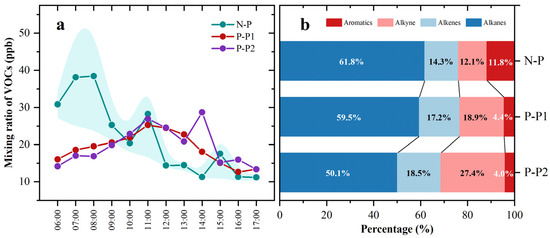 Diurnal variation of VOCs mixing ratio (a) and VOCs composition (b) in N-P, P-P1, and P-P2 period.