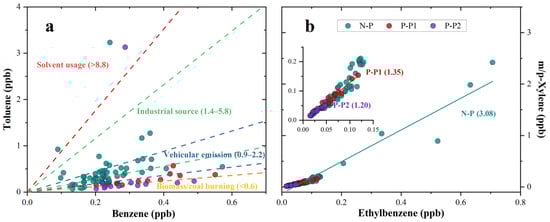 The ratio of compounds with similar atmospheric lifetimes can reflect source characteristics [59,60]. Previous studies indicate that in areas seriously affected by vehicle emissions, the toluene to benzene (T/B) volume ratio ranges from 0.9 to 2.2 [61,62]. The T/B ratio is greater than 8.8 for solvent use [44,45] and ranges from 1.4 to 5.8 for industrial processes [63,64]. For biomass/coal burning sources, the T/B ratio is less than 0.6 [65,66]. In this study, during the non-pollution (N-P) period, the T/B ratio mostly ranges from 1.0 to 2.0, while during the pollution periods P-P1 and P-P2, the T/B ratio ranges from 0.4 to 0.7 (Figure 4a). This indicates a greater influence of vehicle emissions during the N-P period and a larger impact of biomass/coal burning sources during the PM2.5 pollution periods.
