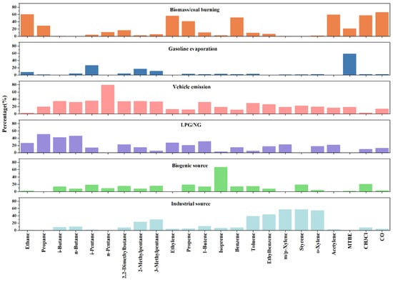 The sources of VOCs during the observation period were further analyzed using the PMF receptor model. When the number of factors was set to six, the Qtrue/Qrobust ratio was 1.0, and the Qtrue/Qexpected ratio was less than 1.5, indicating that the results are reliable [69,70]. Figure 5 presents the profiles of six factors resolved by PMF. Factor 1 had high contributions of CO, acetylene, benzene, ethylene, and chloromethane, which are key markers of biomass/coal burning [42,71]. Therefore, factor 1 was identified as a biomass/coal burning source. Factor 2 exhibited high levels of isopentane (26.4%) and methyl tertiary-butyl ether (MTBE) (58.5%). Isopentane is a typical tracer for gasoline evaporation [8,72], and MTBE is a common gasoline additive [73]. The ratios of isopentane to benzene and isopentane to toluene in this factor were 8.5 and 3.1, respectively, which were consistent with those measured in gasoline vapor [8]. Hence, factor 2 was identified as gasoline evaporation. Factor 3 showed higher proportions of n-butane and n-pentane, C3–C5 alkanes, and C7 aromatics, which are typically associated with vehicle emissions [42]. Consequently, factor 3 was identified as vehicle emissions. Factor 4 had high proportions of ethane, propane, and butane, which are major components of liquefied petroleum gas (LPG) and natural gas (NG) [40,74], thus identified as the LPG/NG source. The dominant species in factor 5 was isoprene (66.9%), primarily emitted from vegetation, indicating factor 5 as the biogenic source [75]. Factor 6 contained high proportions of toluene (38.7%), ethylbenzene (43.5%), m/p-xylene (57.3%), and o-xylene (54.6%). Previous studies have found that C7–C8 aromatics are widely used as industrial solvent [42,44]. Hence, factor 6 was identified as the industrial source.