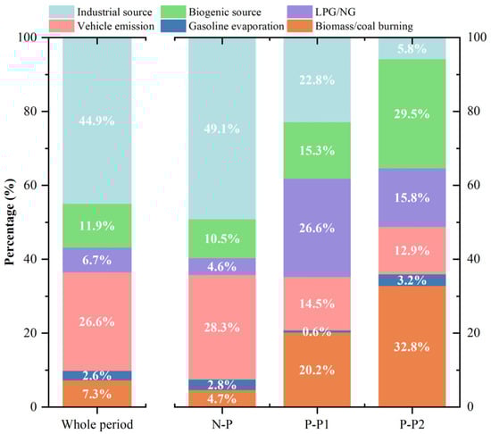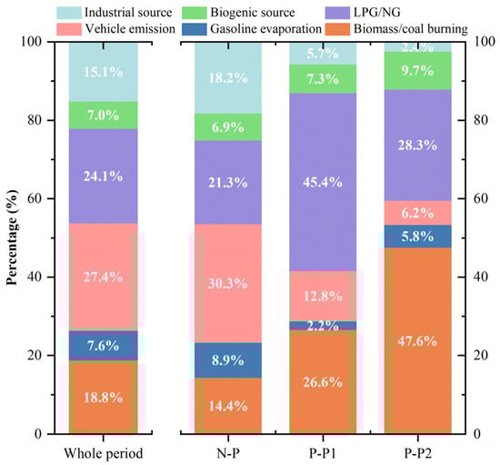 The contributions of various emission sources to total VOCs are shown in Figure 6. During the entire observation period, the distribution of VOCs sources was as follows: vehicle emissions (27.4%) > LPG/NG (24.1%) > biomass/coal burning (18.8%) > industrial sources (15.1%) > gasoline evaporation (7.6%) > biogenic sources (7.0%). During the N-P period, vehicle emissions, LPG/NG, and industrial sources were the largest contributors to VOCs, accounting for 30.3%, 21.3%, and 18.2%, respectively. However, during the pollution periods, the contribution of biomass/coal burning increased significantly, reaching 26.6% in the P-P1 period and 47.6% in the P-P2 period, respectively. This notable increase indicates that during the PM2.5 pollution periods in Hefei, it is crucial to focus on heating and combustion activities to reduce VOCs emissions and potential secondary pollution. The contribution of industrial sources to VOCs was relatively low during the pollution periods, which may be due to the limited industrial activity in the vicinity of the sampling site. Due to low temperature in winter, the contribution of gasoline evaporation and biogenic sources to VOCs remained relatively low (<10%) over different periods, indicating their limited impact on VOCs in winter in Hefei.