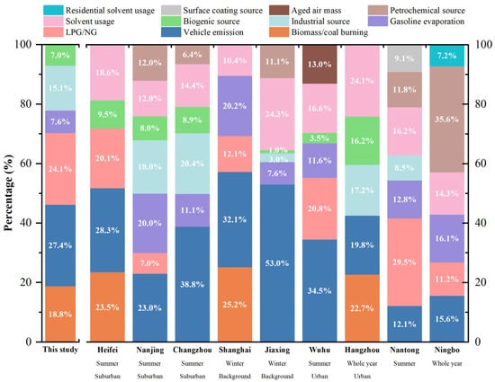 Comparison of VOCs source contributions resolved by PMF among cities in the YRD region. The information of cities was as follows: suburban of Hefei in December 2019 (this study); suburban of Hefei in August 2020 [76]; suburban of Nanjing in July 2018 [79]; suburban of Changzhou in August 2018 [80]; background of Shanghai in January 2019 [77]; background of Jiaxing during winter of 2017–2019 [81]; urban of Wuhu in 2018 [82]; urban of Hangzhou in 2019 [78]; multisite of Nantong in July 2014 [83]; multisite of Ningbo from December 2012 to October 2013 [84].