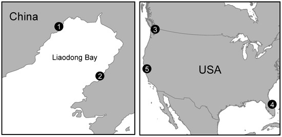 The values of PAR and the quanta-to-energy ratio at Stations 1 and 2 are determined by time-series analysis of spectral irradiance measurements conducted by the Polar Oceanography and Global Ocean Change laboratory (POGOC) in northern Liaodong Bay during the boreal winter of 2012 (Figure 1). The optical instrument PRR-800, manufactured by Biospherical Instruments Inc. (BSI, San Diego CA, USA), was employed to measure surface downwelling irradiance () at 18 specific wavelengths (313, 380, 412, 443, 490, 510, 520, 532, 555, 565, 589, 625, 665, 683, 710, 765, 780, and 875 nm) [3,25,26,27]. Station 3 was conducted by the Remote Sensing Ocean Optics (ORSOO) laboratory under a clear sky in a river near Orcas Island on 20 June 1998 (Figure 1). A Tethered Spectral Radiometer Buoy (TSRB), manufactured by Satlantic Inc. (Halifax, NS, Canada), was utilized to record continuous measurements of downwelling irradiance just above the sea surface at 412, 443, 490, 555, 670, 684, and 700 nm [28]. To compensate for the data gap at low solar zenith angles, this study incorporates National Renewable Energy Laboratory (NREL) observation data recorded under cloudless skies over 20 days in 1987/1988 (Stations 4 and 5, as outlined in Table 2). Detailed information on the instruments used can be found in the Spectral Solar Radiation Database Documentation (https://www.nrel.gov/grid/solar-resource/spectral-solar.html, accessed on 31 January 2024). The NREL measurements include global-horizontal and diffuse-horizontal spectral irradiance (, and ) between 300 and 900 nm, enabling an investigation into the fluctuations of the quanta-to-energy ratio.