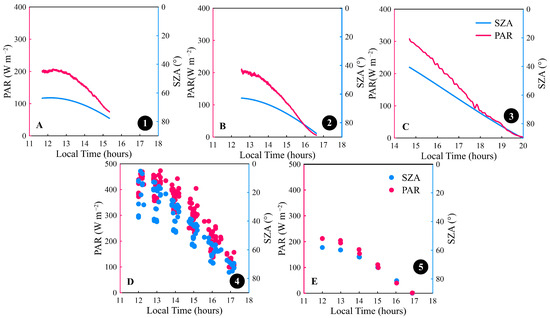 (A–C) Diurnal time series of global irradiance of photosynthetically active radiation (PAR, red line) and coincident variation in solar zenith angle (blue line) for three consecutive measurements (Stations 1–3). The discrete observation data obtained at Stations 4 and 5 are also displayed in panels (D,E) in the same way (red dots for PAR and blue dots for solar zenith angle).