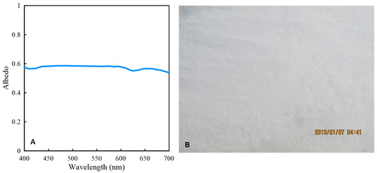 Underlying surface albedo measurements at Station 2 (A), a location characterized by snow-covered sea ice (B).