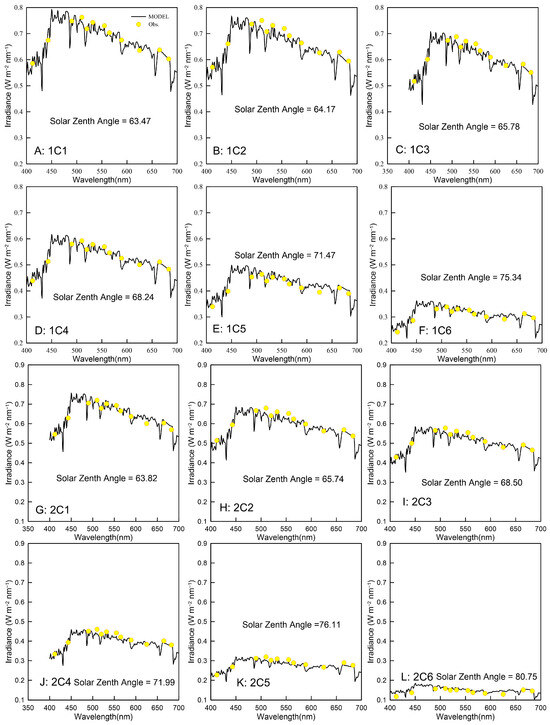 Comparison of the simulated downwelling irradiance (black solid line) with the observation value at specific wavelengths (yellow dots). The requisite environmental variables utilized for the simulation process are enumerated in Table 3, with panels (A–L) corresponding to 1C1 to 2C6 in the table, respectively. The solar zenith angle during each observation is indicated within the individual plots.