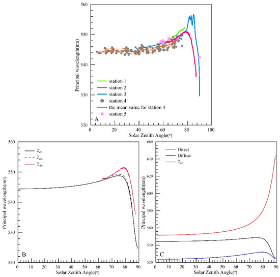 Variation in the principal wavelength with increasing solar zenith angles (SZA). Panel (A) shows the observation principal wavelength for each of the five stations. Panel (B) is the comparison of the observation principal wavelength (red line) with the simulated value at Station 2 using the observed time series of atmospheric parameters (dashed line). The solid line represents the simulated output under the same atmospheric conditions of 1C1 with an SZA range of 0–90°. Panel (C) depicts the fluctuation of principal wavelength derived from global irradiance (black line), diffuse irradiance (blue line), and direct irradiance (red line) simulated by SPCTRAL2 as simulated by SPCTRAL2 in the identical meteorological conditions as 1C1 in Table 3.