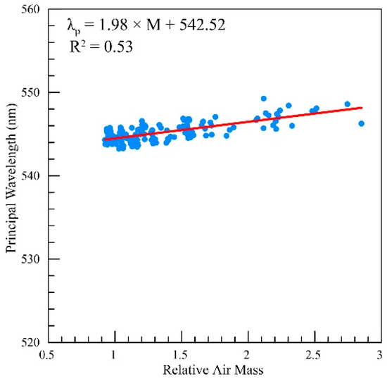 The linear relationship between the principal wavelength and relative air mass. The blue dots represent the observation value of the principal wavelength at Station 4, while the red solid line denotes the relationship obtained through linear regression analysis. The linear regression equation, displayed in the upper left corner, exhibits a coefficient of determination (R2) of 0.53.
