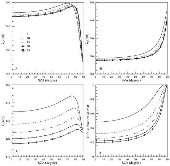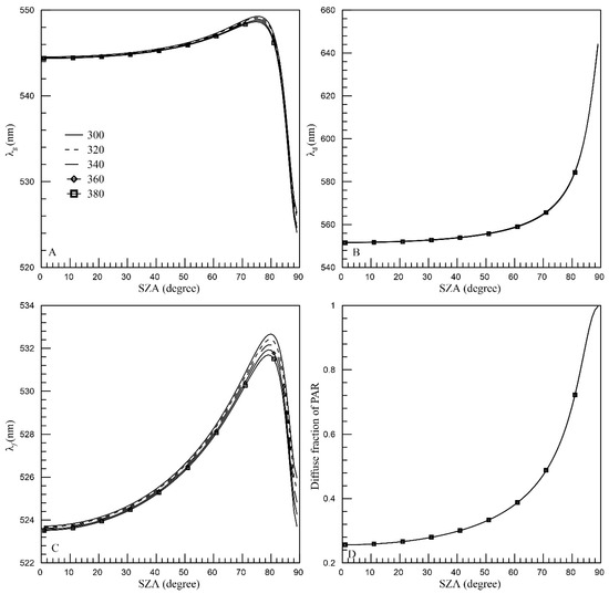 Taking Station 2 as an example in Figure 5C, is observed to be greater than , while lies between the two, which may also be deduced from Equation (5). As the SZA increases, exhibits an increasing trend, whereas initially grows and subsequently drops. According to Equation (5), varies as a function of the diffuse fraction (f). When f is small, is more strongly influenced by . For instance, at a 30° SZA, the fraction of diffuse irradiance is 0.28, and the computed value of is 544.85 nm, which is closer to the value of of 552.69 nm. As the SZA increases, so does the diffuse irradiance fraction, reaching 0.56 at a 75° SZA. Concurrently, the value of 548.79 nm is found to be closer to the value of 531.35 nm. Upon further increase in SZA, f reaches 0.89 at an 85° SZA. The computed value at this moment is 537.73 nm, which is more closely aligned with = 529.18 nm. The rapid drop in principal wavelength can be attributed to the substantial increase in the diffuse fraction of PAR.