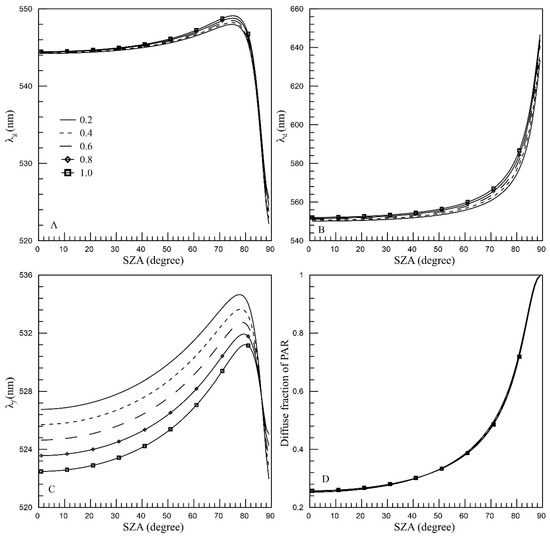 Both the simulated principal wavelength obtained from the SPCTRAL2 model and the observed values exhibit consistent trends (Figure 5B). However, at high SZAs, the observed principal wavelength is greater than the simulated values. Rayleigh scattering can be employed to elucidate the fluctuation of the principal wavelength at low SZAs. Deirmendjian and Sekera [33] demonstrated that in a clean, clear atmosphere, Rayleigh scattering leads to a shift in the maximum spectral irradiance within the PAR region towards longer wavelengths as the solar zenith angle increases, resulting in the depletion of blue radiation. Nonetheless, this phenomenon cannot fully account for the abrupt decrease in principal wavelength observed at higher SZA. To address this, the definition formula of the principal wavelength was modified, and a relationship with the diffuse fraction of PAR (f) was established, yielding the following Equation: