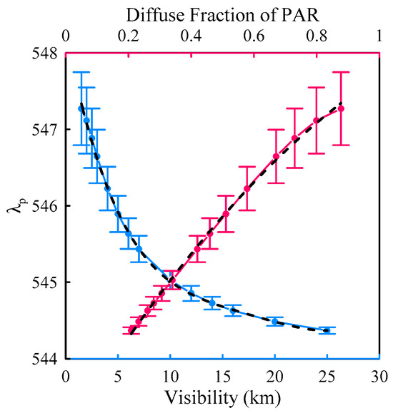 The polynomial fitting relationships of the principal wavelength for global irradiance at an SZA of 20° with visibility (blue) and the diffuse fraction of PAR (red).