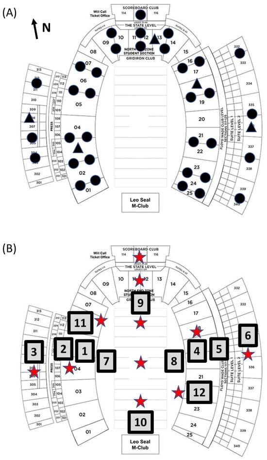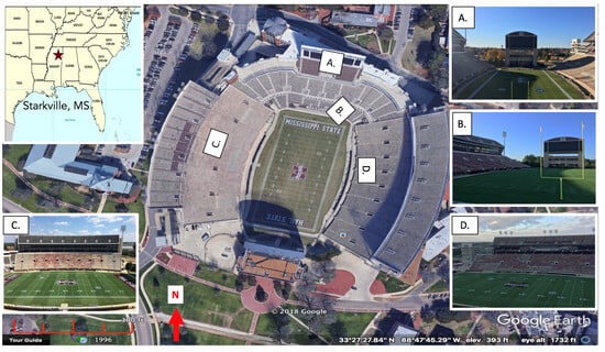 This study was conducted in Davis Wade Stadium on the campus of Mississippi State University in Starkville, MS, USA (33.450° N, 88.818° W). The stadium is used primarily for American-style football games and had a capacity of 61,337 at the time of this study []. The stadium is open-sky and characterized as “U-form” or horseshoe [] with one open side, a continuous lower tier, and a discontinuous upper tier (Figure 1). The town of Starkville is located in the southeastern United States, which experiences a humid subtropical (Cfa) climate characterized by hot and humid summers and mild to cool winters with no distinct dry season.