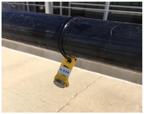 To measure the temperature and humidity of the stadium, iButton sensors were attached to small plastic fobs and secured with plastic zip ties to railings throughout the stadium at heights ranging from 0.5 to 1.2 m above the ground (Figure 2). Two types of iButtons were used: Thermochrons (DS1921G-F5), which measure temperature only, and Hygrochrons (DS1923), which measure both temperature and relative humidity. Each iButton has a thermal response time of approximately 2 min, while the accuracy of the iButtons range from ±1.0 °C for Thermochrons to ±0.5 °C for Hygrochrons [].