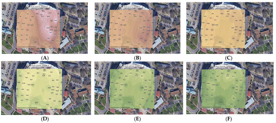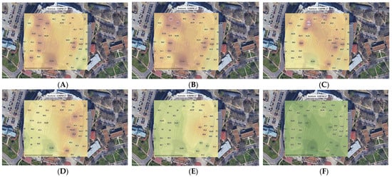 Same as Figure 4, except for temperatures on 10 September 2016. The first map (A) shows temperatures one hour prior to the game start time (5:00 p.m.). Maps (B–E) show temperatures from the game start time to the game end time (6:00 p.m. to 9:00 p.m.). The last map (F) shows temperatures one hour after the game’s end time (10:00 p.m.). Contour lines and shading are in 1 °F increments ranging from 76 °F (dark green) to 107 °F (pink). High-resolution versions of each map can be found in Supplemental File.
