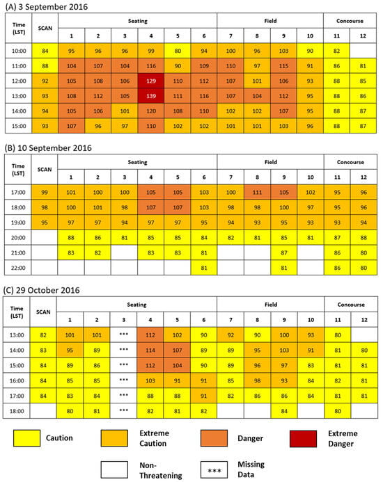 Hourly heat index values (°F) recorded within the stadium and at the SCAN station beginning one hour prior and ending one hour after the end of the game on (A) 3 September 2016, (B) 10 September 2016, and (C) 29 October 2016. Column numbers correspond with the numbered locations in Figure 3B. Values in the chart are color-coded according to the National Weather Service heat stress categories provided in Table 2.