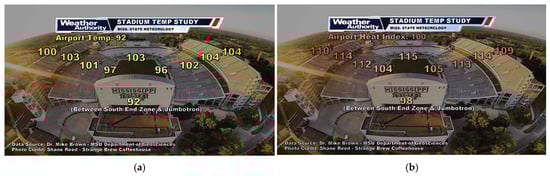 Those in charge of game day operations rely on forecasts of meteorological conditions to assess potential hazards. However, these forecasts are for conditions outside the stadium, which, as shown in this study and others [,,,], can be very different from conditions inside the stadium. In this study, several locations in the stadium were found to be thermally oppressive, placing spectators and other stadium occupants at risk for heat-related illness. Moreover, heat exposure can be very localized, with temperatures varying by as much as 10 °C within the seating areas of the stadium. Relying on observations from the nearest weather station or from official weather forecasts would not have revealed this hazard. Instead, by mapping conditions across various parts of the stadium, game day officials and emergency managers can better identify where exposure to heat is the greatest and allocate additional staff and resources to those areas. These maps, along with real-time observations, can also be used by local meteorologists to communicate the heat hazard within the stadium (Figure 7), as well as inform design modifications and renovations to reduce heat exposure.