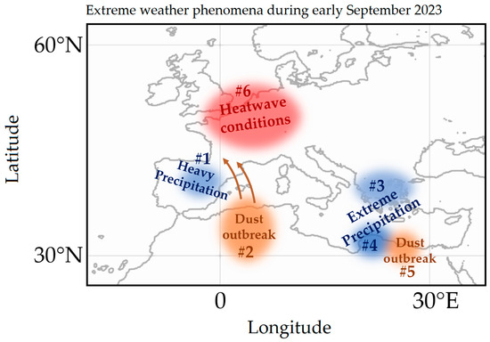 Extreme weather phenomena recorded surrounding the Mediterranean Sea and across Europe between 1 and 12 September 2023. (#1) Heavy precipitation in Spain, (#2) dust outbreak from Sahara Desert, (#3) extreme precipitation in Greece, (#4) extreme precipitation in Libya, (#5) dust outbreak from Western Egyptian Desert, and (#6) heatwave conditions in Northern France and Britain.