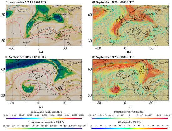 (a) Geopotential height at 250 hPa (contour, unit: meters) and ozone mass mixing ratio at 250 hPa (coloured areas, unit: kg·kg−1) on 1 September, at 1800 UTC; (b) potential vorticity (coloured areas, unit: K·m2·kg−1·s−1) and wind speed (coloured arrows, unit: m·s−1) at 250 hPa on 2 September, at 0000 UTC; (c) same as (a), but on 3 September, at 1200 UTC; (d) same as (b), but 3 September, at 1800 UTC.