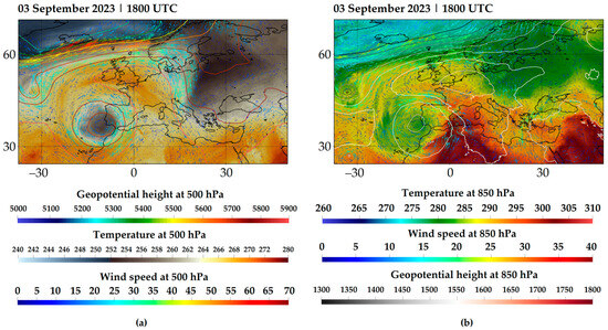 (a) Geopotential height at 500 hPa (contour, unit: meters), temperature at 500 hPa (coloured areas, unit: kelvin) and wind speed (coloured arrows, unit: m·s−1) at 500 hPa on 3 September, at 1800 UTC; (b) geopotential height at 850 hPa (contour, unit: meters), temperature at 850 hPa (coloured areas, unit: kelvin) and wind speed (coloured arrows, unit: m·s−1) at 850 hPa on 3 September, at 1800 UTC.