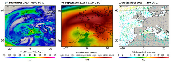 (a) Total column water vapor (coloured areas, unit: mm) on 3 September, at 0600 UTC; (b) mean sea level pressure (coloured areas, unit: Pa) on 3 September, at 1200 UTC; (c) wind speed (coloured arrows, unit: m·s−1) at the surface on 3 September, at 1800 UTC.