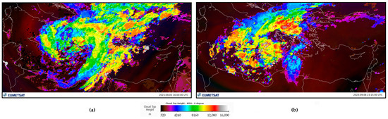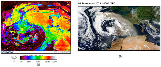 Satellite observation: (a) cloud top height on 3 September, at 1800 UTC (Source: [32]); and (b) MODIS Corrected Reflectance image on 4 September 2023, at 0000 UTC (Source: [34]).