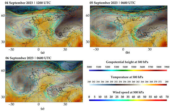 Figure 16 summarises the main features of the period that led to the extreme weather phenomena highlighted in Figure 1. The period began with the development of a cut-off low over the Iberian Peninsula between 1 and 3 September, caused by an upper-air trough that deepened over the western Iberian Peninsula (Figure 16a). The low-pressure system was associated with thunderstorms that produced heavy precipitation and flooding in Toledo, Spain, in the late afternoon of 3 September (Figure 16b). On 4 September, the same weather system favoured the transport of mineral dust from the Sahara Desert to Spain and Southwestern France (Figure 16b). On the other hand, as the jet stream turned northward, curving across the top end of the UK and Scandinavia, and back down south toward Greece, the omega blocking pattern began its establishment on 5 September with the development of a low-pressure system over Greece (Figure 16c). The surface wind favoured moist air advection into the system and intensified cloud development processes. The thunderstorms produced extreme precipitation and flooding in Greece, Bulgaria, and Turkey. Simultaneously, the high-pressure system produced heatwave conditions over Northern France and the UK (Figure 16c).