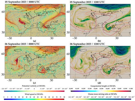(a) Potential vorticity (coloured areas, unit: K·m2·kg−1·s−1) and wind speed (coloured arrows, unit: m·s−1) at 250 hPa on 5 September, at 0000 UTC; (b) geopotential height at 250 hPa (contour, unit: meters) and ozone mass mixing ratio at 250 hPa (coloured areas, unit: kg·kg−1) on 5 September at 1200 UTC; (c) same as (a), but for 6 September, at 0000 UTC; and (d) same as (b), but for 6 September, at 1200 UTC.