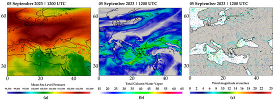 (a) Mean sea level pressure (coloured areas, unit: Pa) on 5 September, at 1200 UTC; (b) total column water vapour (coloured areas, unit: mm) on 5 September, at 1200 UTC; and (c) wind speed (coloured arrows, unit: m·s−1) at the surface on 5 September, at 1200 UTC.