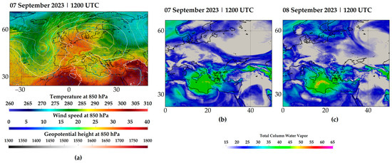 (a) Geopotential height at 850 hPa (contour, unit: meters), temperature at 850 hPa (coloured areas, unit: kelvin) and wind speed (coloured arrows, unit: m·s−1) at 850 hPa on 7 September, at 1200 UTC; total column water vapor (coloured areas, unit: mm) (b) on 7 September, at 1200 UTC, and (c) on 8 September, at 1200 UTC.