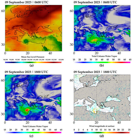 The storm system’s pressure continues to drop the following day (Figure 12a). At this moment, the system contains a precipitable water amount of above 55 mm (Figure 12b). As the system approached the Libyan coast in the late afternoon of 9 September (Figure 12c), the storm intensified and the high amount of precipitable water (>55 mm) favoured the development of an agglomeration of thunderstorms. Additionally, the storm system also presents intense rotating winds of magnitude above 15 m·s−1 close to the storm’s centre at the surface (Figure 12d).