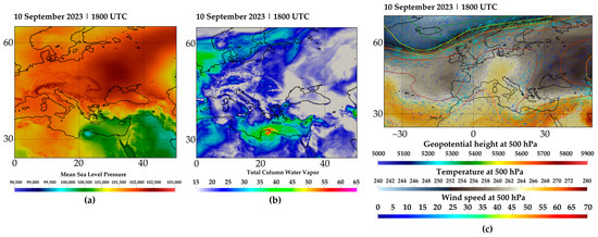 (a) Mean sea level pressure (coloured areas, unit: Pa) on 10 September, at 1800 UTC; (b) total column water vapor (coloured areas, unit: mm) on 10 September, at 1800 UTC; and (c) geopotential height at 500 hPa (contour, unit: meters), temperature at 500 hPa (coloured areas, unit: kelvin) and wind speed (coloured arrows, unit: m·s−1) at 500 hPa on 10 September, at 1800 UTC.