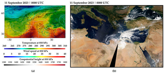(a) Geopotential height at 850 hPa (contour, unit: meters), temperature at 850 hPa (coloured areas, unit: kelvin) and wind speed (coloured arrows, unit: m·s−1) at 850 hPa on 11 September 2023, at 0000 UTC; and (b) MODIS Corrected Reflectance image on 11 September 2023, at 0000 UTC (Source: [34]).