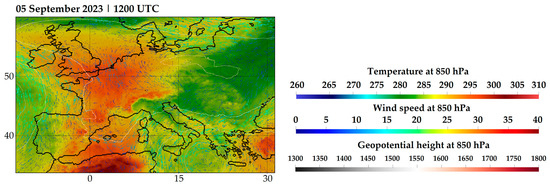 Geopotential height at 850 hPa (contour, unit: meters), temperature at 850 hPa (coloured areas, unit: kelvin) and wind speed (coloured arrows, unit: m·s−1) at 850 hPa on 5 September 2023, at 1200 UTC.