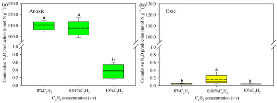 As depicted in Figure 1, a markedly higher cumulative N2O production was observed during anoxic incubation than during oxic incubation, indicating that the anoxic conditions greatly enhanced N2O emissions. The cumulative N2O production under anoxic conditions was 110.0, 107.6, and 0.37 nmol N g−1 in the 0%C2H2, 0.01%C2H2, and 10%C2H2 treatments, respectively. Notably, a high concentration of acetylene (i.e., 10%C2H2) did not result in increased N2O production compared to the 0.01%C2H2 treatment. Under oxic conditions, the cumulative N2O production was 0.046, 0.16, and 0.044 nmol N g−1 for the 0%C2H2, 0.01%C2H2, and 10%C2H2 treatments, respectively. The cumulative N2O production in the 0.01%C2H2 treatment was significantly higher than those in the other treatments (p < 0.05). Notably, similar to anoxic incubation, a high acetylene concentration did not elevate N2O production during oxic incubation.