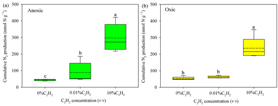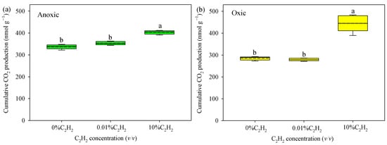As shown in Figure 4, under anoxic conditions, the results of cumulative CO2 production were 337.3, 353.3, and 403.2 nmol C g−1 in the 0%C2H2, 0.01%C2H2, and 10%C2H2 treatments, respectively. When compared with the 0%C2H2 and 0.01%C2H2 treatments, a high C2H2 concentration (i.e., 10%C2H2) significantly increased CO2 production (p < 0.05). A similar trend was observed under oxic conditions, with a high concentration of C2H2 (10%) treatment exhibiting the highest cumulative CO2 production (445.5 nmol C g−1) compared to the other treatments.