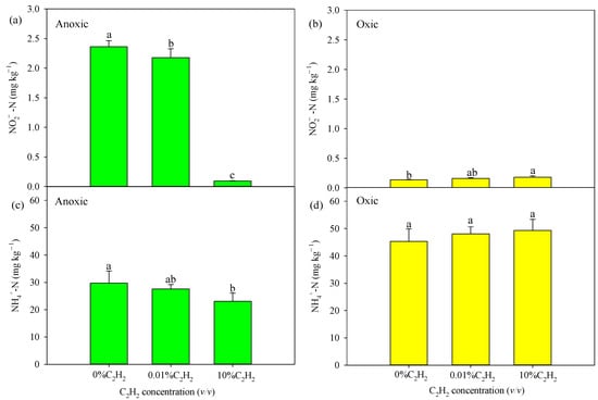 Under anoxic conditions, the nitrite (NO2−) accumulated concentration was 2.36, 2.18, and 0.095 mg N kg−1 in the 0%C2H2, 0.01%C2H2, and 10%C2H2 treatments, respectively (Figure 5a). The accumulations of NO2− in the 0%C2H2 and 0.01%C2H2 treatments were significantly (p < 0.05) higher than that in the 10%C2H2 treatment, showing that higher acetylene concentration could slow down NO2− accumulation, possibly by enhancing NO2− reduction during anoxic incubation. Conversely, NO2− concentration was significantly higher in the treatment with a high acetylene concentration (i.e., 10%C2H2) than in that without acetylene (i.e., 0%C2H2) during oxic incubation (Figure 5b, p < 0.05).