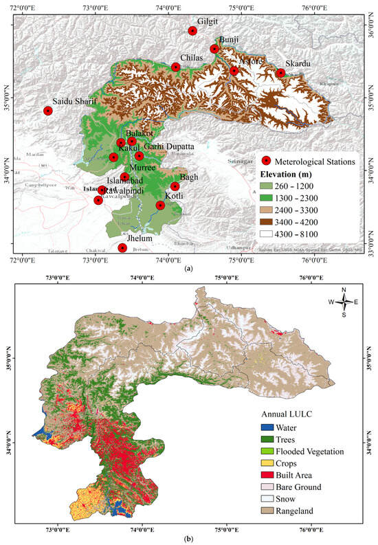 (a) Topographic map of the Himalayan Mountain of Pakistan. (b) Land use/land cover (LULC) map of the study area.