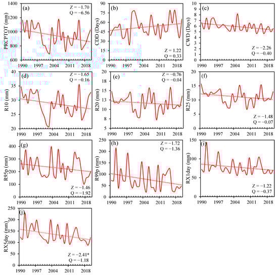 Linear trends of precipitation indices including (a) PRCPTOT, (b) CDD, (c) CWD, (d) R10, (e) R20, (f) R25, (g) R95p, (h) R99p, (i) RX1day, and (j) Rx5day in the Himalayan Mountains of Pakistan. In these graphs, Z represents the MMK test statistics and Q denotes the slope of the trend. The symbol * shows the statistically significant value at a 95% confidence level.
