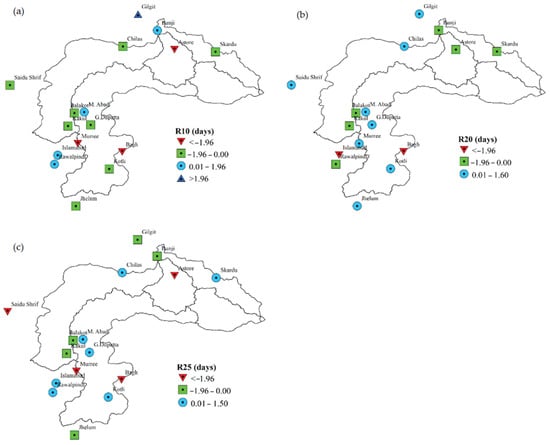 Maps displaying the spatial variations in the results of the MMK test for (a) R10, (b) R20, and (c) R25 across the Himalayan Mountains of Pakistan. Stations exhibiting Z values > 1.96 signify a statistically significant increasing trend, while those with Z values < −1.96 reflect a statistically significant decreasing trend at the 95% confidence level.