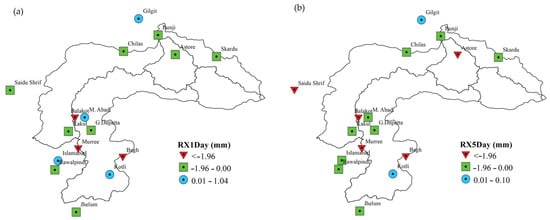 Trends of RX1Day (“monthly maximum 1-day precipitation”) and RX5Day (“monthly maximum 5-day precipitation”) at all considered stations are displayed in Figure 7. It was found that the RX1Day significantly decreased at three stations (Bagh, Balakot, Murree), with Z-values less than −1.96. While nine stations showed a decreasing tendency of this index, only four stations (Gilgit, Kotli, Muzaffarabad, Rawalpindi) showed an increasing potential of RX1Day. The trend rate of RX1Day varies from −1.89 mm/year to 0.88 mm/year. The results of RX5Day showed that only two stations (Gilgit and Kotli) experienced an increasing trend of monthly maximum 5-day precipitation. Five stations (Astore, Bagh, Balakot, Murree, and Saidu-Sharif) exhibited a significantly decreasing trend of this index, with Z < −1.96. Other stations indicated a decreasing tendency of 5-day maximum precipitation in this region. The change rate of RX5day varies between −3.61 and 0.10 mm/year.