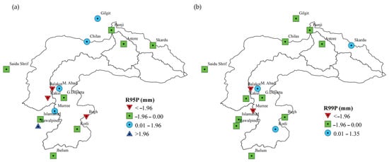 Spatial distribution maps of the MMK test result for (a) R95p and (b) R99p indices.