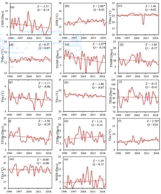 Temporal variabilities of temperature indices (during 1991–2020) in the Himalayan Mountains of Pakistan. In (a–n), Z signifies the MMK test statistics, while Q indicates the slope of the trend. The symbol * shows the statistically significant value at 95% confidence level.