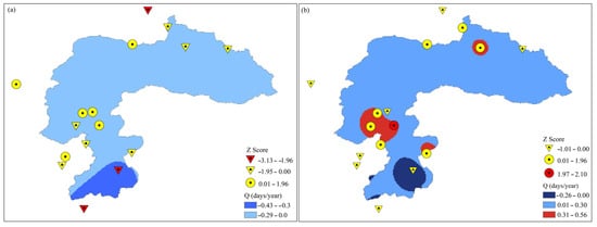 Spatial distribution maps of the MMK test result for (a) the cold spell duration index (CSDI) and (b) the warm spell duration index (WSDI).