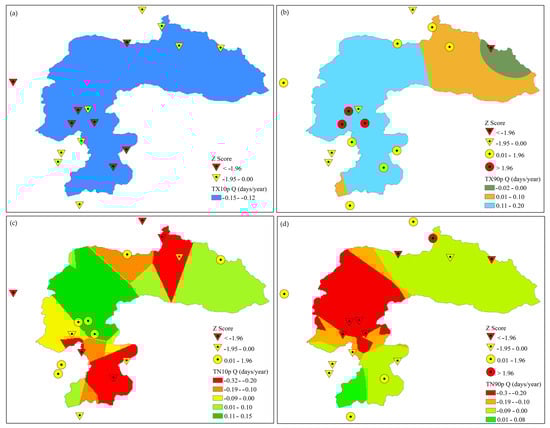 Spatial variations in the Z and Q for (a) TX10p, (b) TX90p, (c) TN10p, and (d) TN90p across the study domain.
