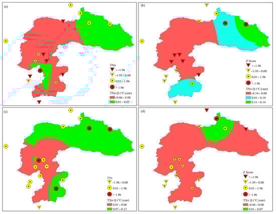 Spatial distribution maps of the Z and Q values for (a) TNn, (b) TNx, (c) TXn, and (d) TXx.