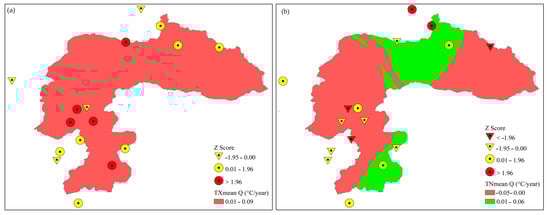 Spatial variation maps of Z and Q values for (a) TXmean and (b) TNmean.
