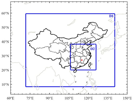Simulation region by using the Weather Research and Forecasting (WRF) model. D1 and D2 denote the outer and inner nested grids, with spatial resolutions of 9 km and 3 km, respectively, and the red triangle represents the location of the aircraft icing accident.