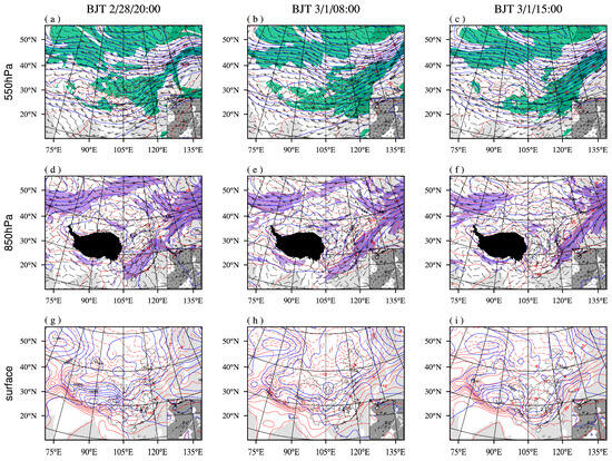 Atmospheric circulation situation before and at the time of the icing accident: (a–c) 550 hPa and (d–f) 850 hPa geopotential height, temperature, and wind fields, as well as (g–i) surface pressure and temperature fields at (a,d,g) 20:00 BJT (Beijing Standard Time) on 28 February, (b,e,h) 08:00 BJT on 1 March and (c,f,i) 15:00 BJT on 1 March. The blue lines in (a–f) represent the isoheight contours (interval of 4, unit: 10 gpm). The green shaded areas in (a–c) indicate the relative humidity larger than 60%, the purple shaded areas in (d–f) denote the wind speed larger than 12 m/s, and the blue lines in (g–i) represent the isobars (interval of 5, unit: hPa). “H” and “L” represent the high- and low-pressure centers, respectively. The red contours indicate the isotherms (interval of 4, unit: °C), where solid and dotted lines denote the positive and negative values. The red triangles in (g–i) show the location of the aircraft icing accident.